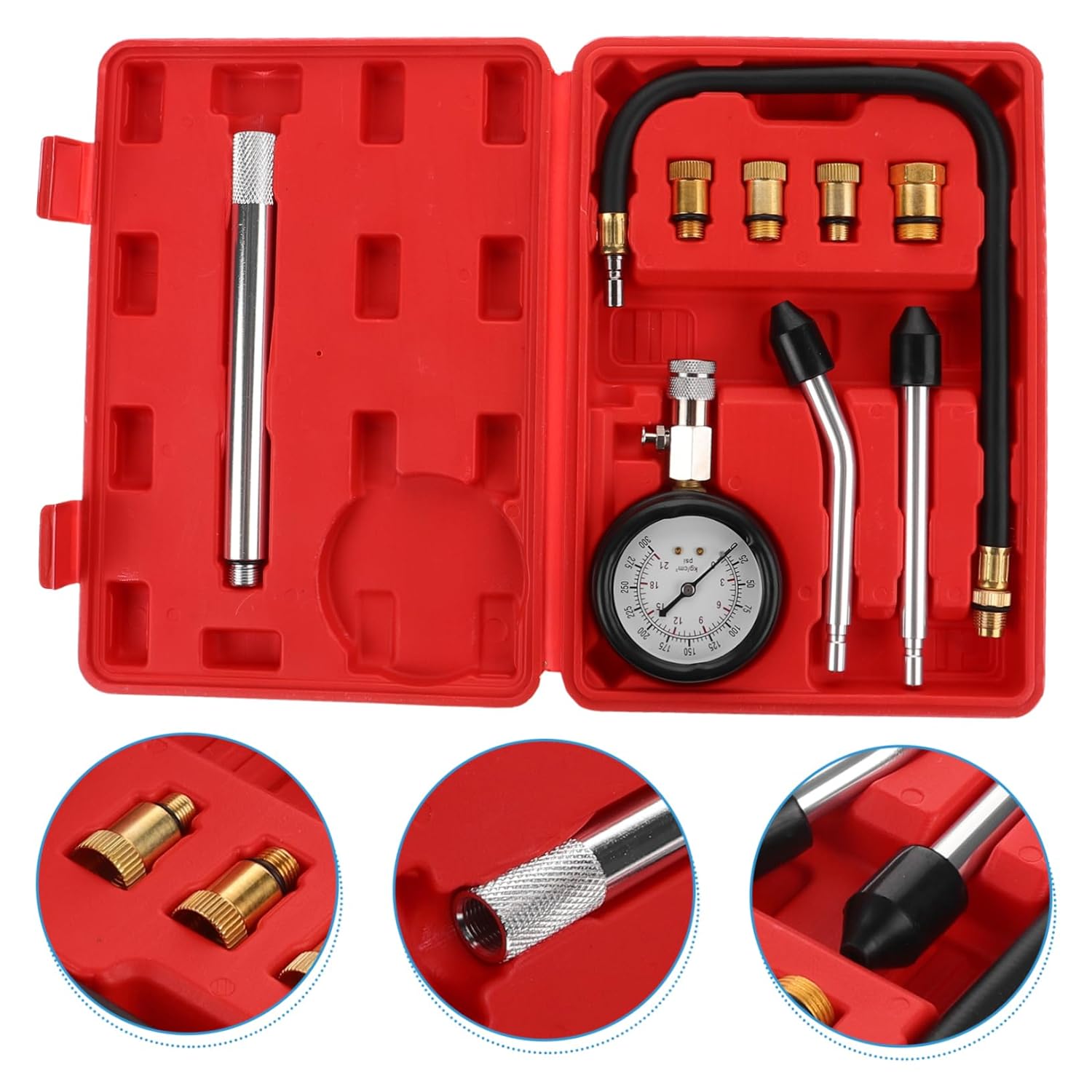 Include 1 x set of automobile pressure gauge Features -Size:28.00X20.00X5.00cm/11.00X7.86X1.97in compression gauge -Material:Aluminium alloy,plastic compression gauges -Color:Multi engine oil tester -It provides precise measurements of cylinder pressure, which significantly improves the efficiency and accuracy of various repair and maintenance tasks leak down tester automotive. -The comprehensive kit includes all the essential tools required for a variety of repair needs, ensuring maintenance engine compression test. -The user-friendly design ensures that it is easy to operate, making it accessible for individuals of all skill levels, from beginners to professionals pressure tester. -This tool set is built to last, offering exceptional durability and reliability for long-term use outboard compression tester. -This versatile pressure gauge set is designed to be compatible with both cars and motorcycles, making it a highly adaptable tool for a wide range of application engine compression gauge.Goods Informationoutboard compression tester This versatile tool ensures accurate cylinder pressure readings, making your repair tasks , it durability and reliability, ensuring long-term use.engine compression test The Multi-Function Pressure Gauge Set is designed to cater to both automotive and motorcycle needs
