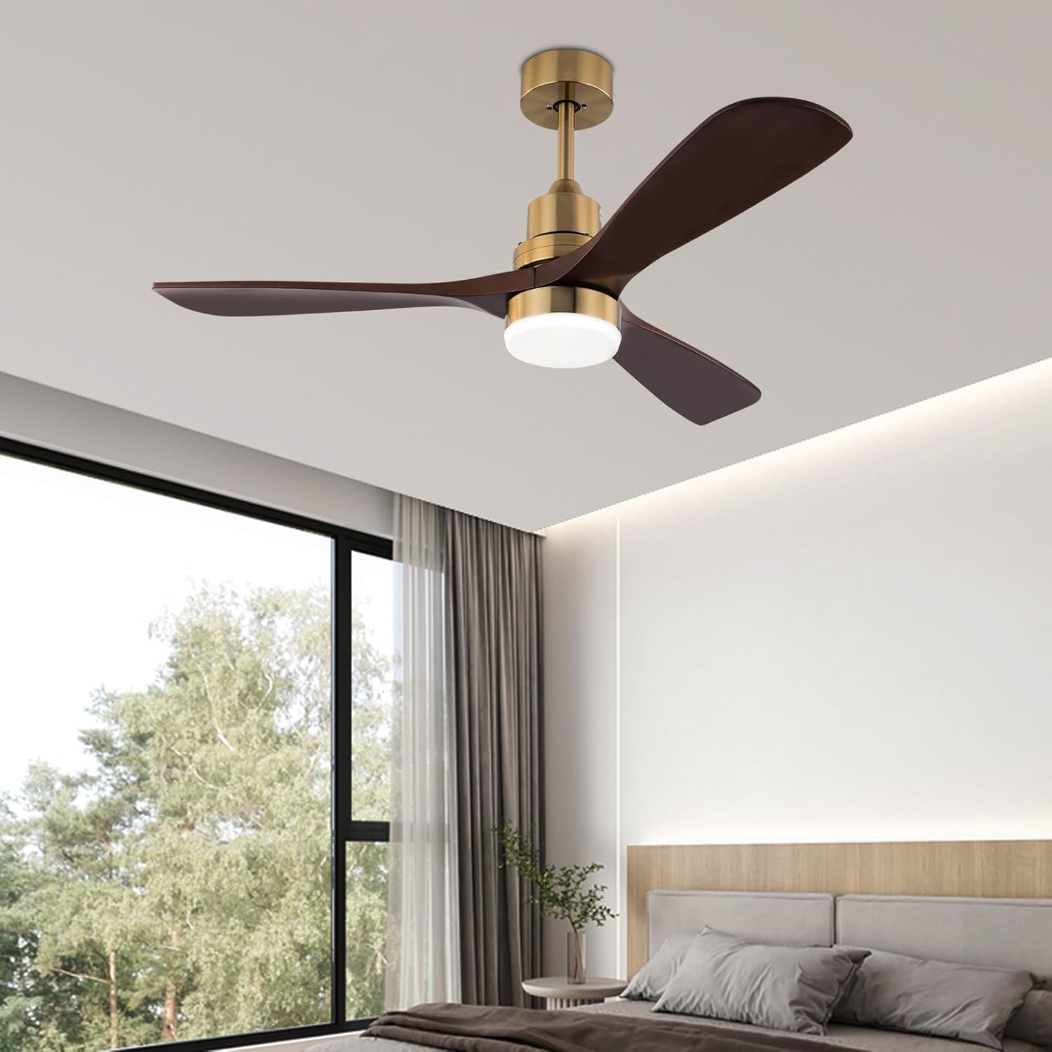 Key FeaturesHigh Adaptability: You can choose to install any of the 2 equipped lamp poles of 4.8" and 9.8" in height according to your needs. Its wide voltage design(85-265V) makes it adapt to different voltage environments. Easy to Clean: The smooth surface and open structure allow you to simply wipe dust away with a soft cloth.Exquisite Gift: With good performance and unique appearance, it can be used as a housewarming gift for parents, friends, and lovers so that they can also enjoy a more exquisite life.DetailsPure Copper Motor: The pure copper motor has stable operation, high efficiency, and low noise (35db) to provide plenty of power for the fan.Glass Lampshade: It has high transparency that ensures bright and even lighting, bringing you visual pleasure while protecting your eyes.Round Base: The 5.9-inch base increases the contact area with the ceiling, which makes the support more stable and improves safety during use.SpecificationsColor: Copper ColorMaterial: Iron, GlassProcess: Polish, ElectroplatingLight Source: LEDMount Type: Ceiling MountedAssembly Required: YesMotor Type: Pure Copper MotorNumber of Wind Gears: 6Reverse Function: YesVoltage: 85-265VMotor Power: 40WNoise Level: 35dBColor Temperature: 3000K, 4500K, 6000KIllumination Area: 10-15㎡/107.64-161.46ft²Suitable Height: 2.8m/9.19ftRemote Control Battery Type: 2*AAA Batteries(Included)Remote Control Distance: 3-5m/9.84-16.4ftTime Setting: 1, 2, 4 HoursEfficiency: EEU Energy Label Efficiency Labeling Class: A++to EProduct Overall Size(With Short Rod)(D*H): 121*38cm/48*14.96inchProduct Overall Size(With Long Rod)(D*H): 121*50cm/48*19.68inchRods Length: 12cm/4.8inch, 25cm/9.8inchEach Fan Blade Length: 62cm/24.4inchLampshade Diameter: 15cm/5.9inchBase Diameter: 15cm/5.9inchPackage Included1*Ceiling Fan Light1*Romote Control1*English InstructionAll Needed Accessories